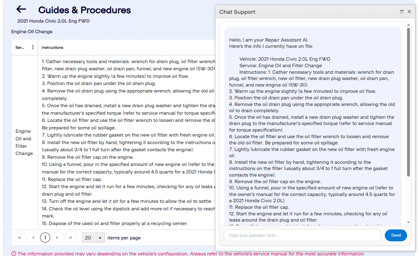 Our AI repair assistant is a free vehicle repair AI chatbot that provides support to you, the mechanic and auto technician, during vehicle maintenance. Its primary use is to answer labor-related questions that arise during the repair process.